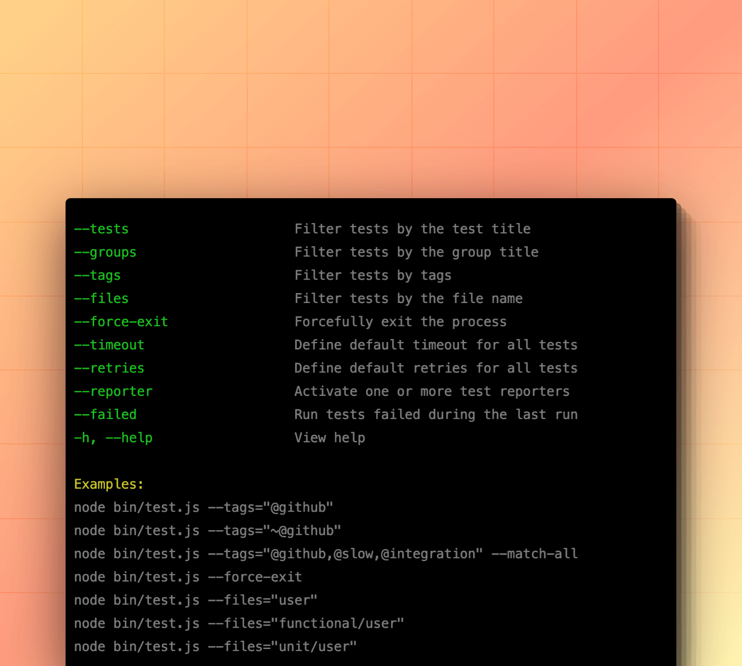 The Japa entrypoint file acts as a mini CLI application and allows you to pass arguments and flags to configure the tests runner. You can view the available options using the --help flag.