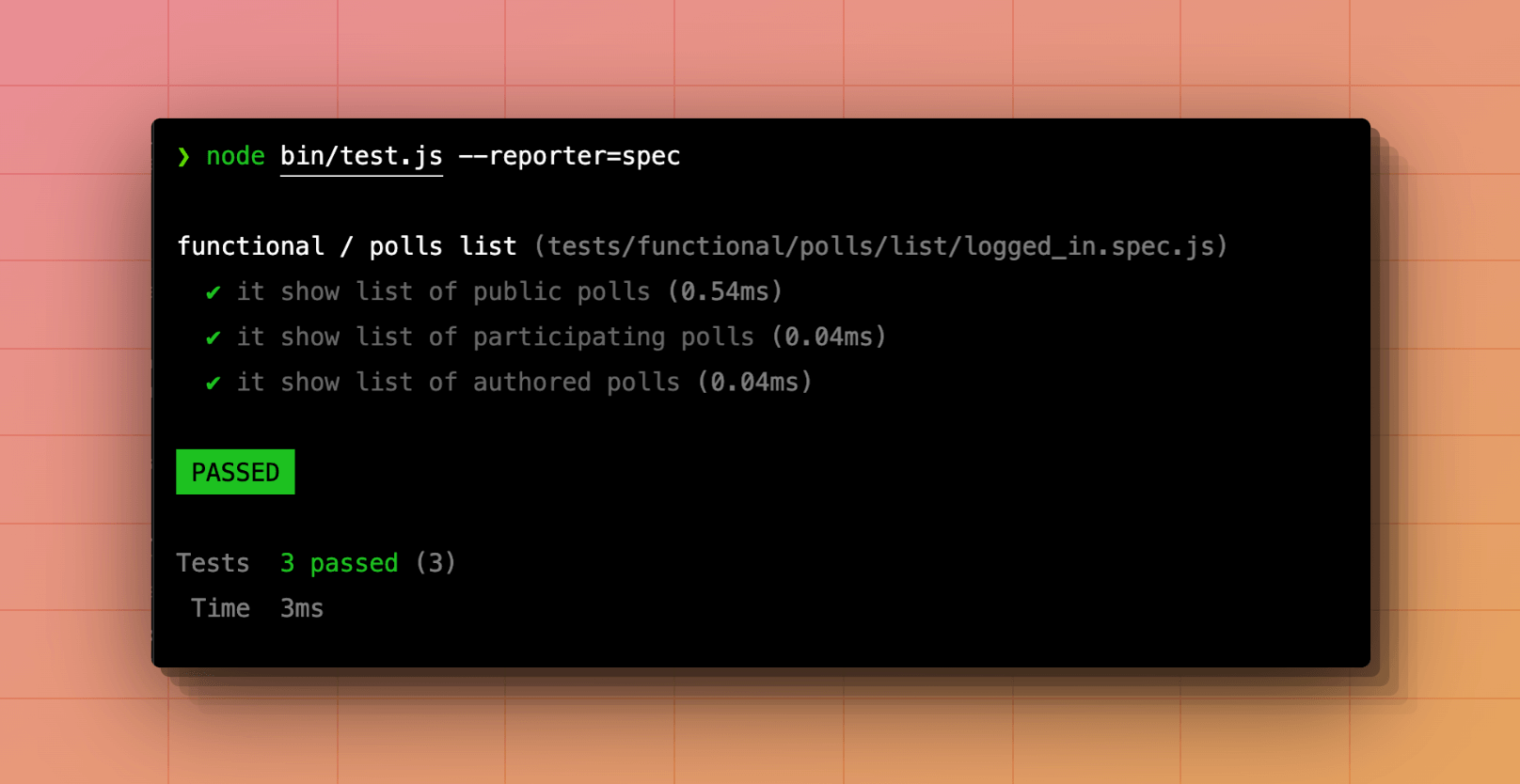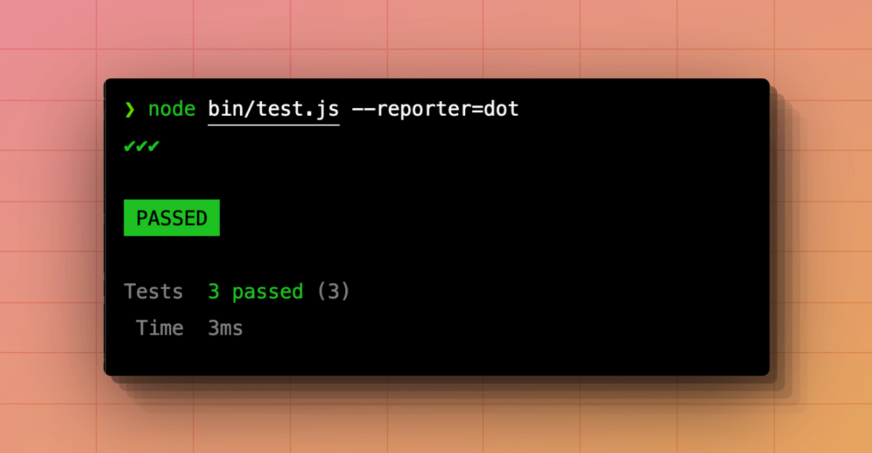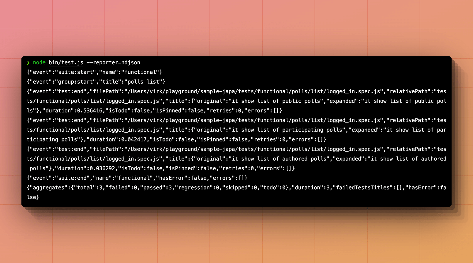 The ndjson reporter outputs each event as a valid JSON string to the terminal. The JSON output is an excellent fit for programmatic use cases.